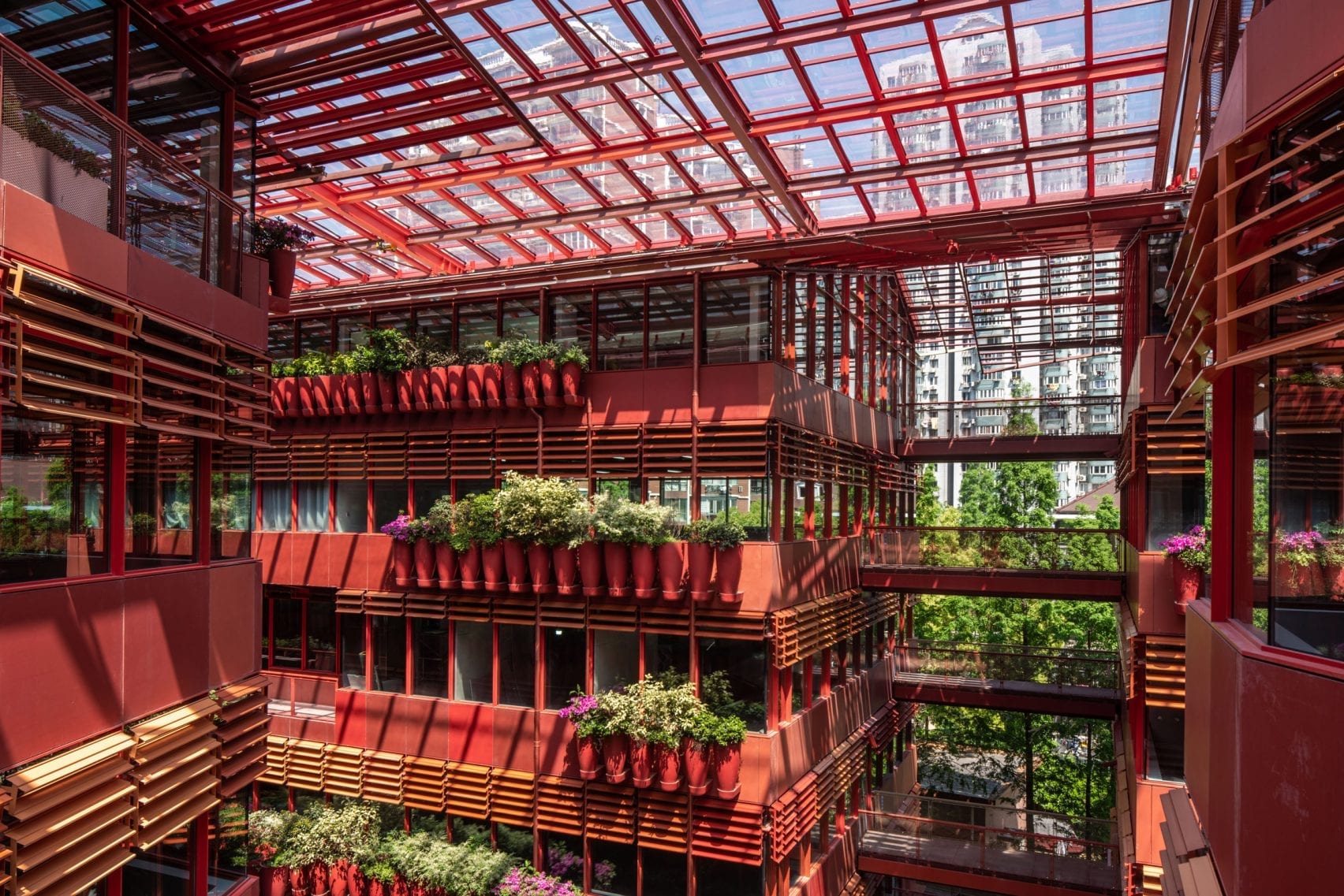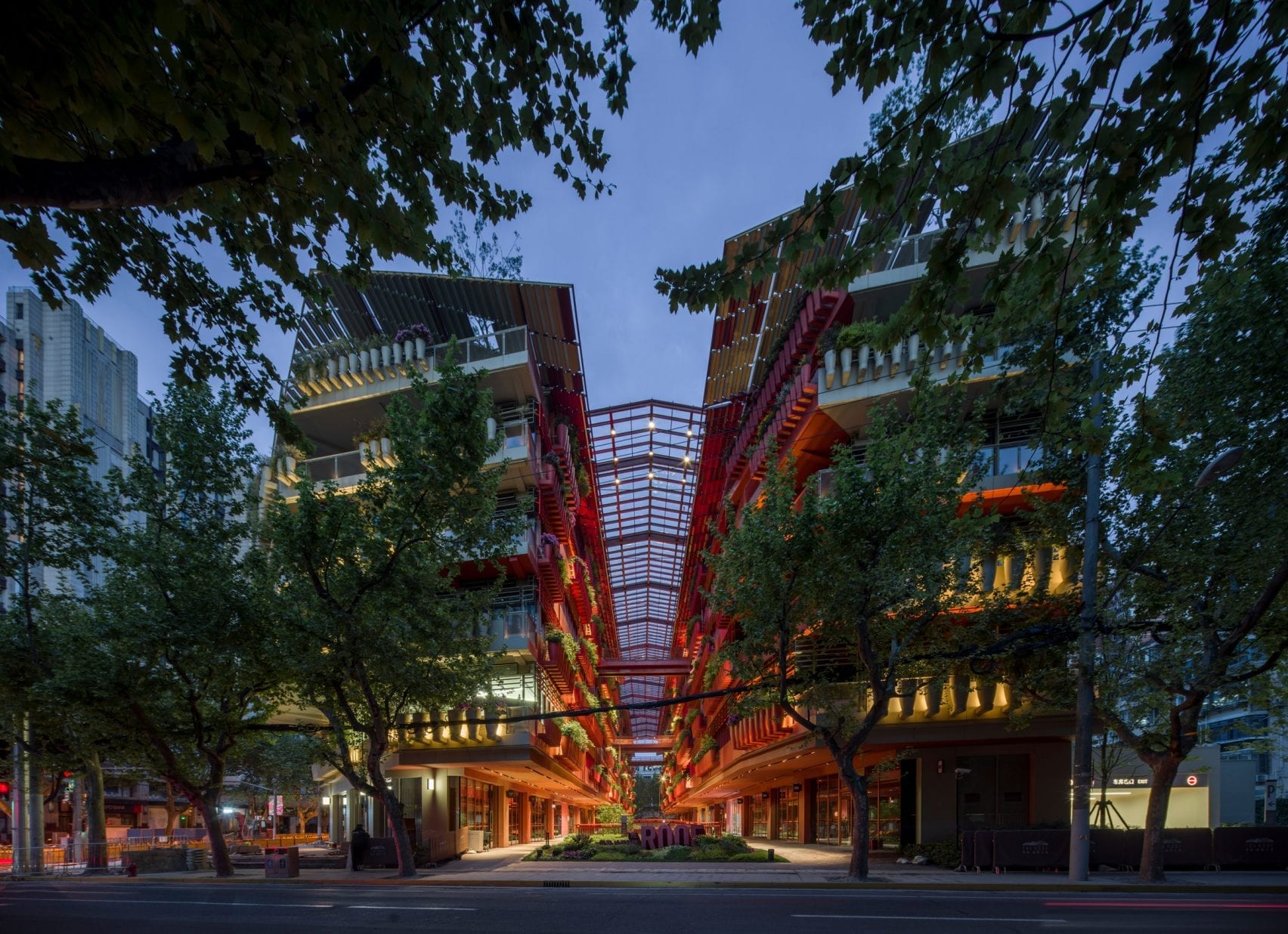 Tiandi building. Арх. Жан Нувель. 2021 год. Многофункциональный центр, который занимает исторический квартал между двумя оживлѐнными улицами — Ма Данг и Дан Шуй. Здание разделили на две половинки, чтобы обустроить пешеходную зону под названием «Улица 1000 красных вазонов».
