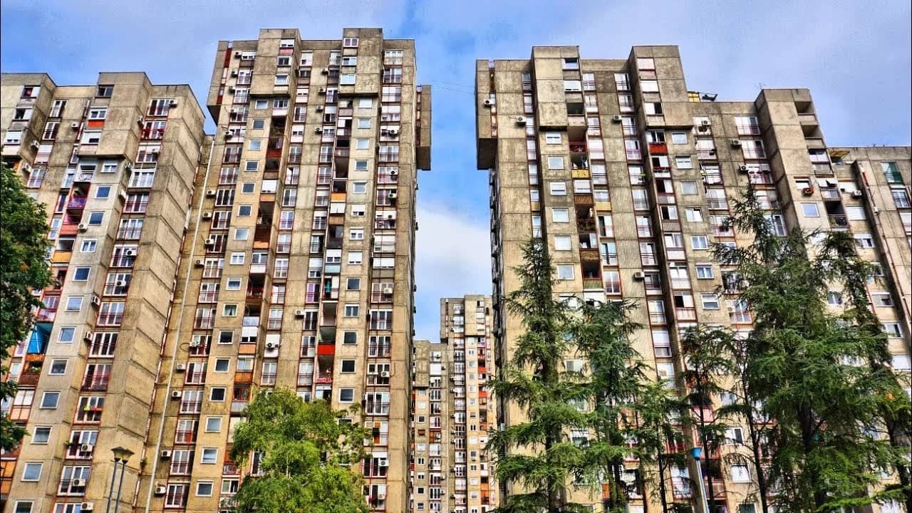 Район Видиковац с изогнутыми домами и круглыми балконами.